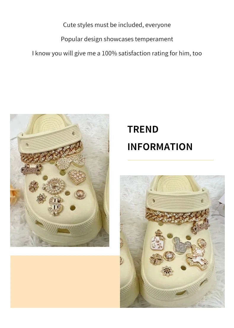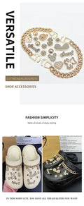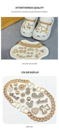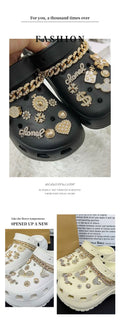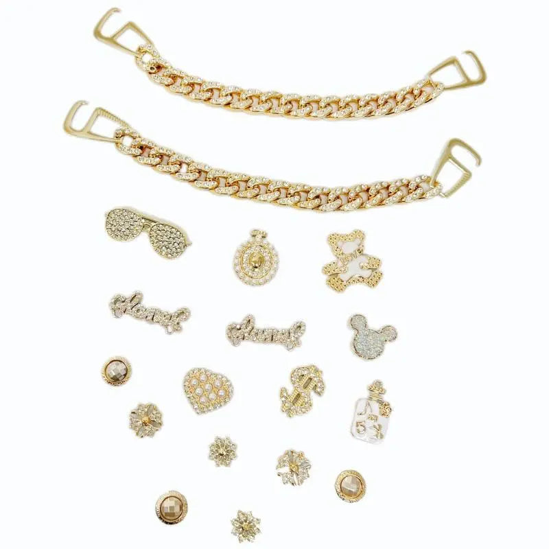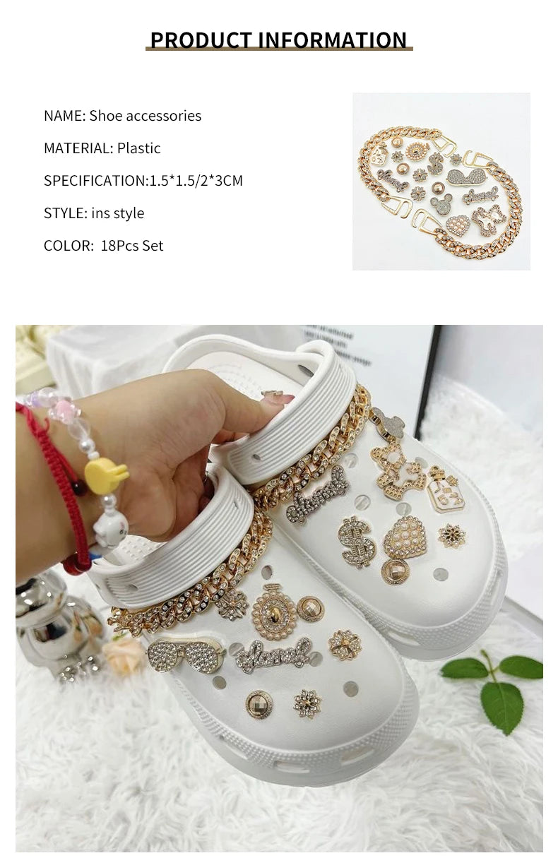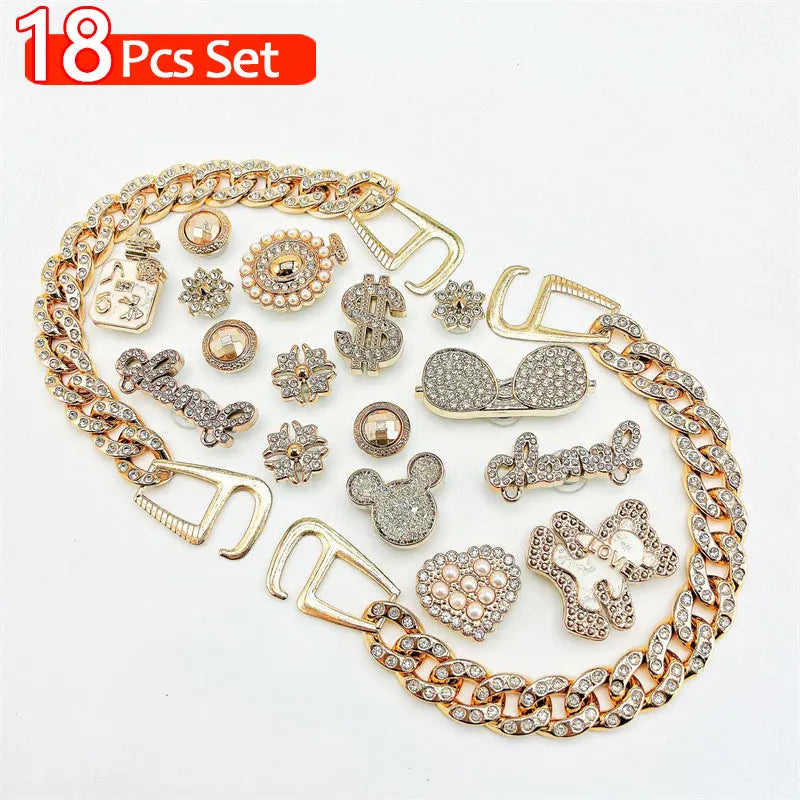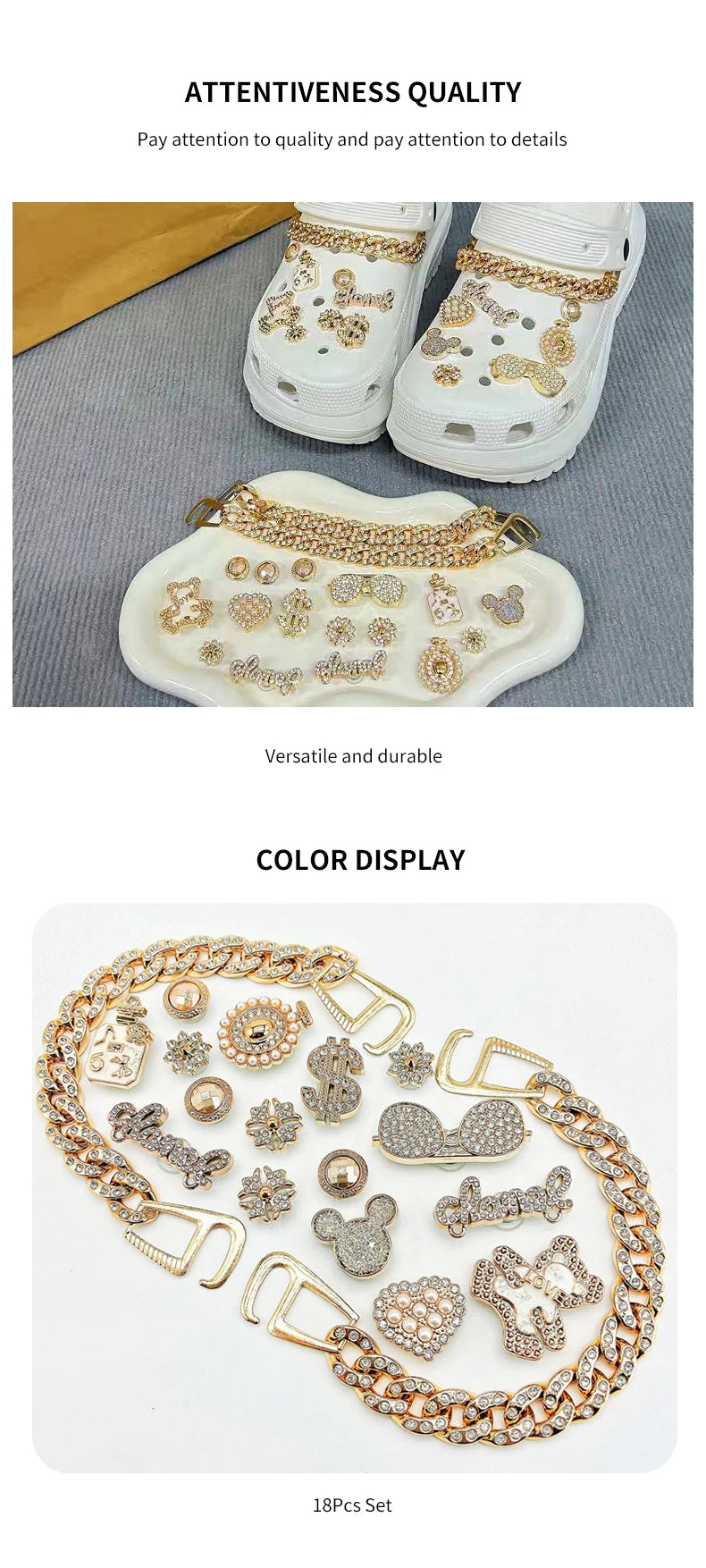 18Pcs Bling Shoe Charms for Clog Girly Cute Designer Golden Bling Shoe Charms Shoe Decoration with Bling Chain