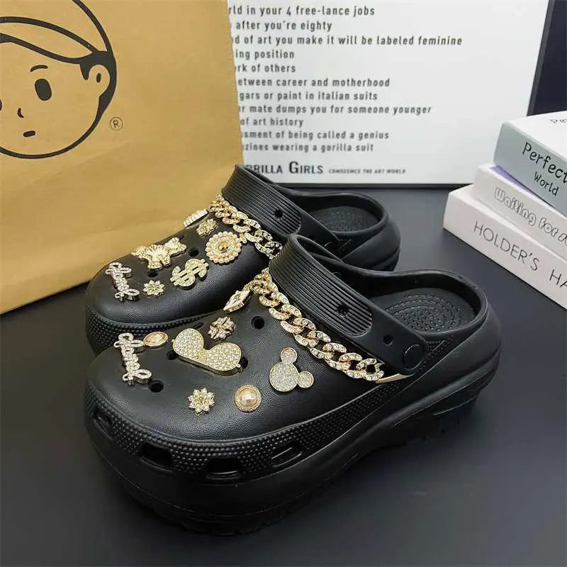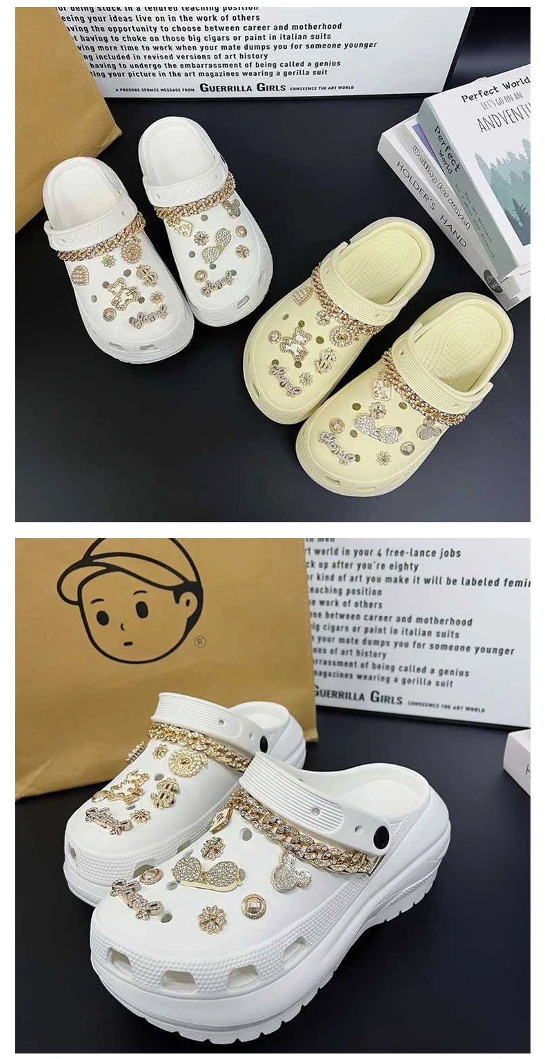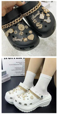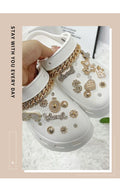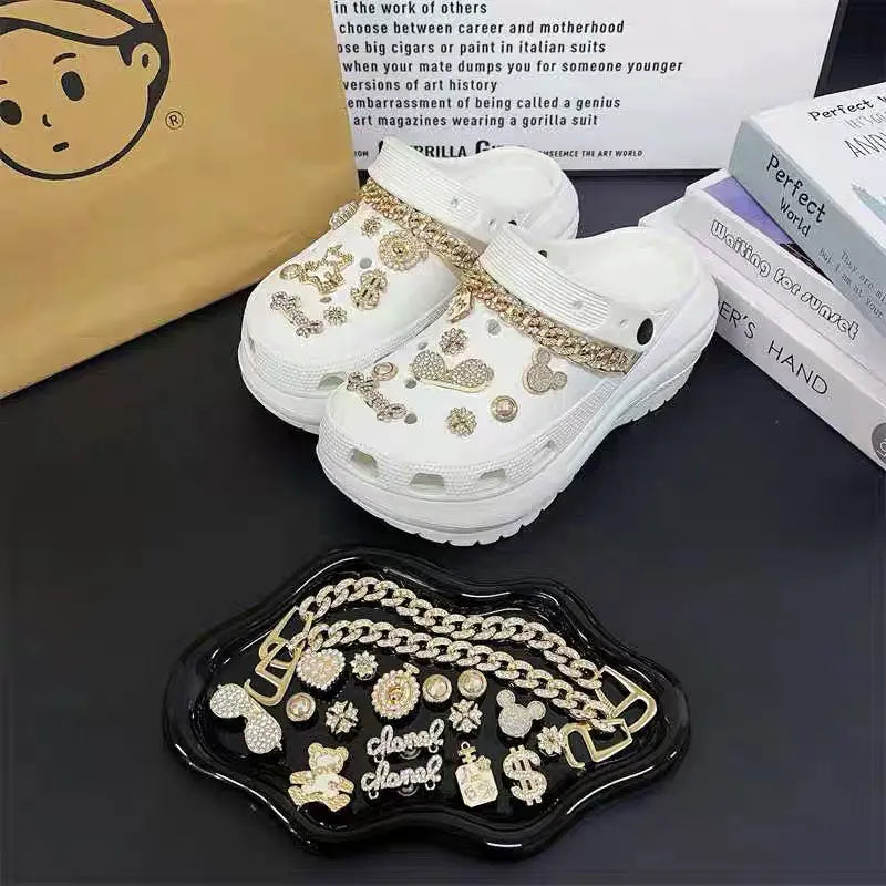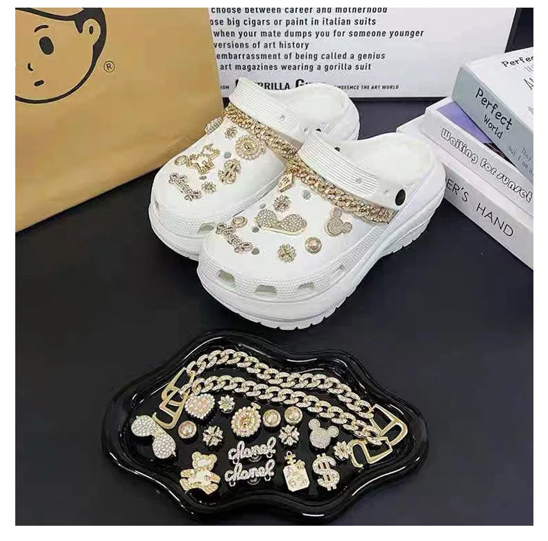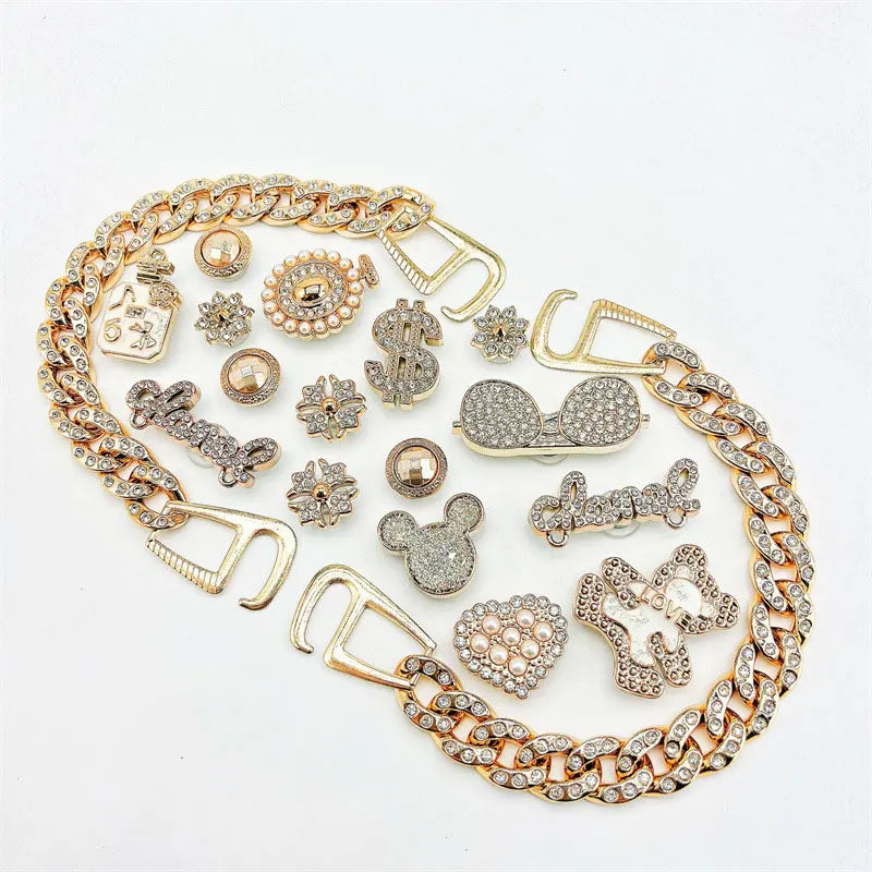 18Pcs Bling Shoe Charms for Clog Girly Cute Designer Golden Bling Shoe Charms Shoe Decoration with Bling Chain