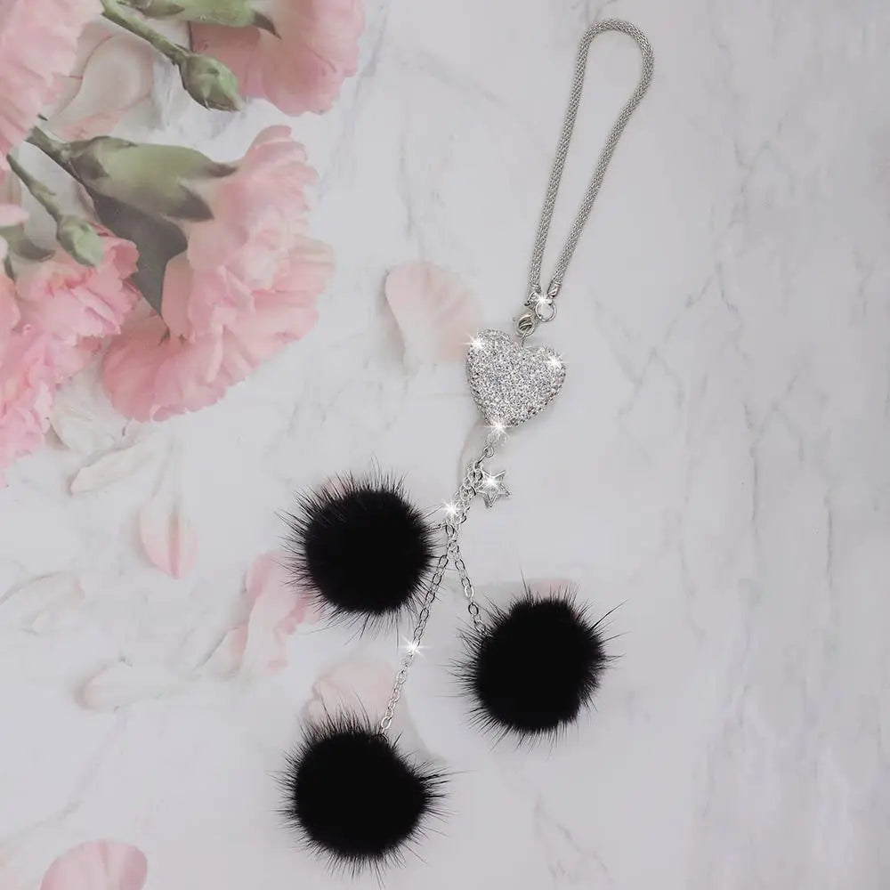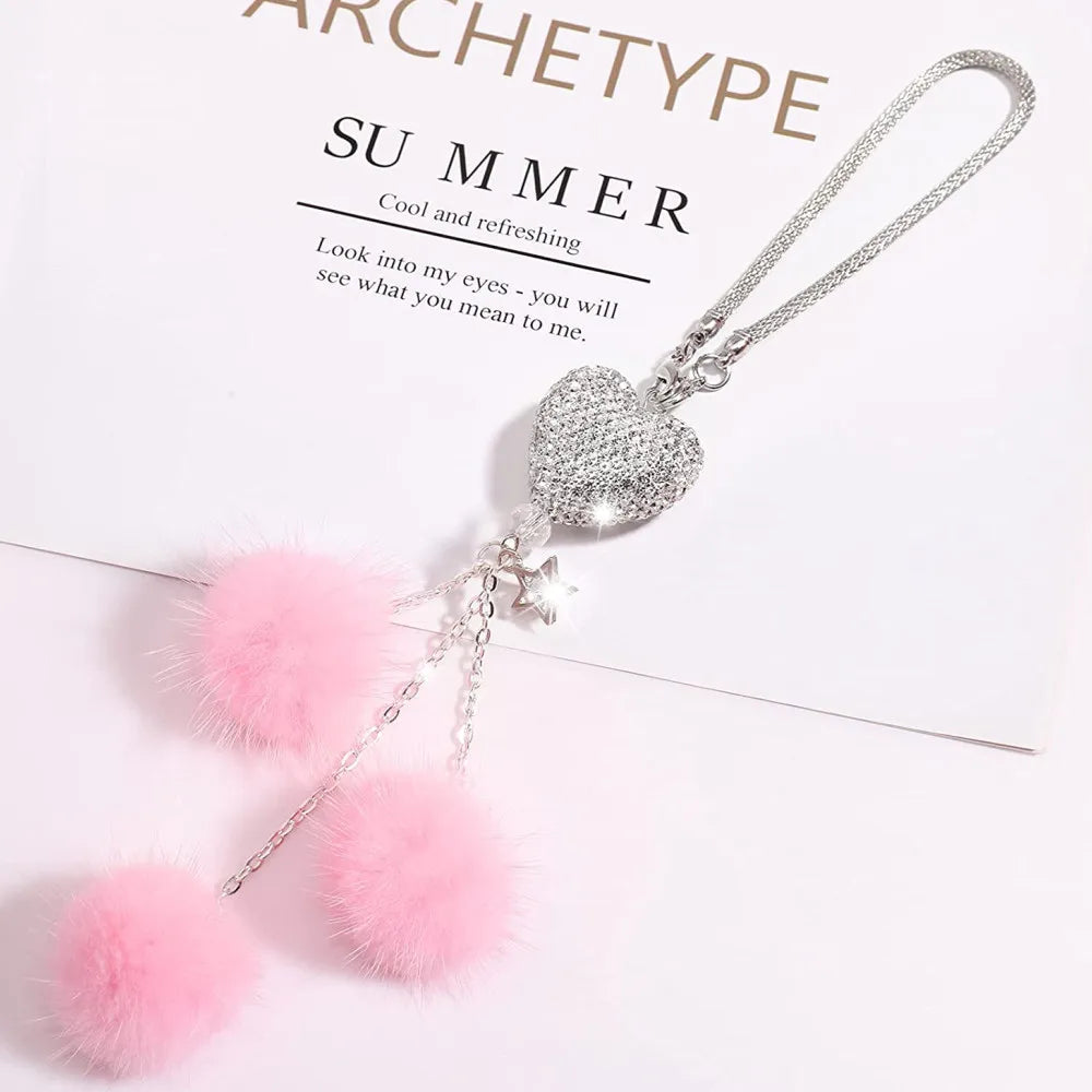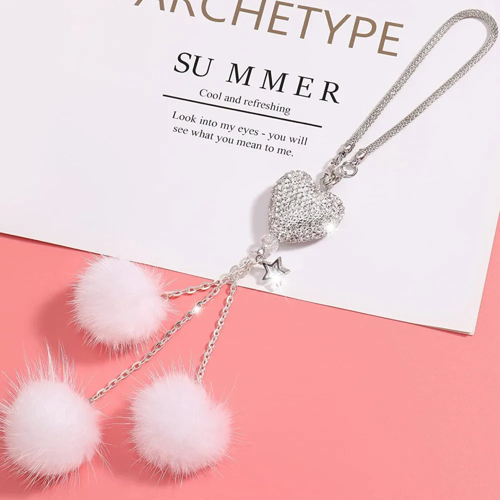 Bling Car Mirror Accessories for Women Men Love Heart and Pink Plush Ball Rinestones Car Accessories Car Rear View Mirror Charms