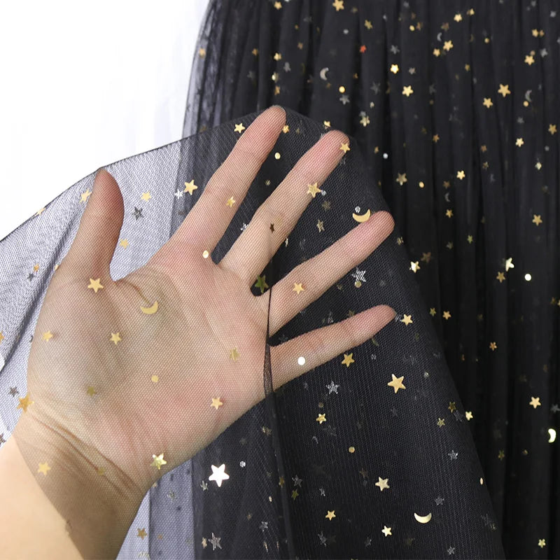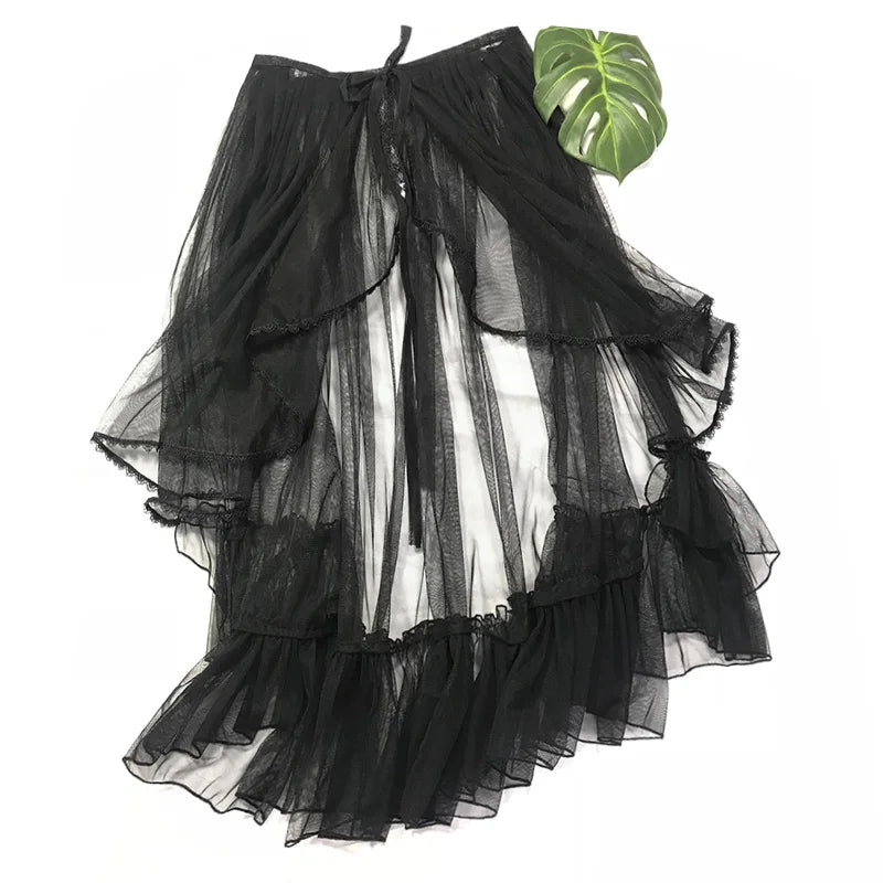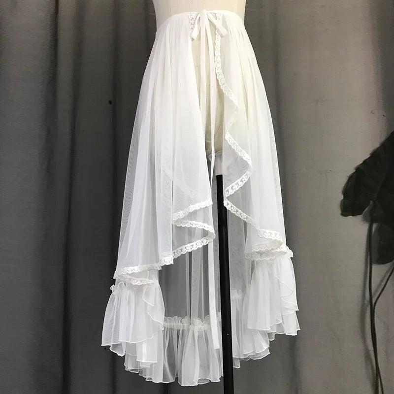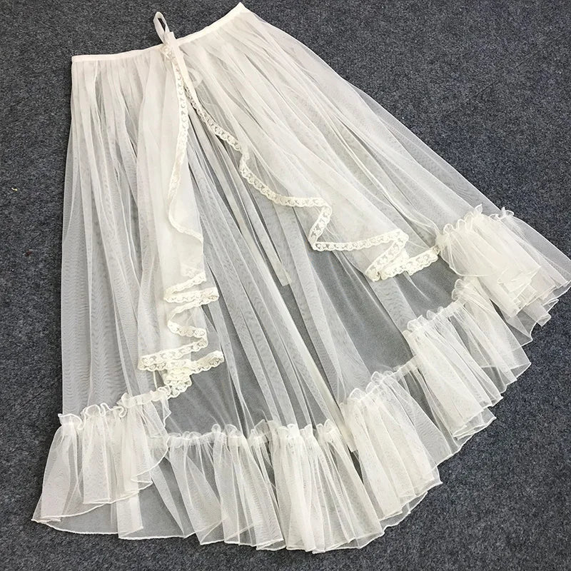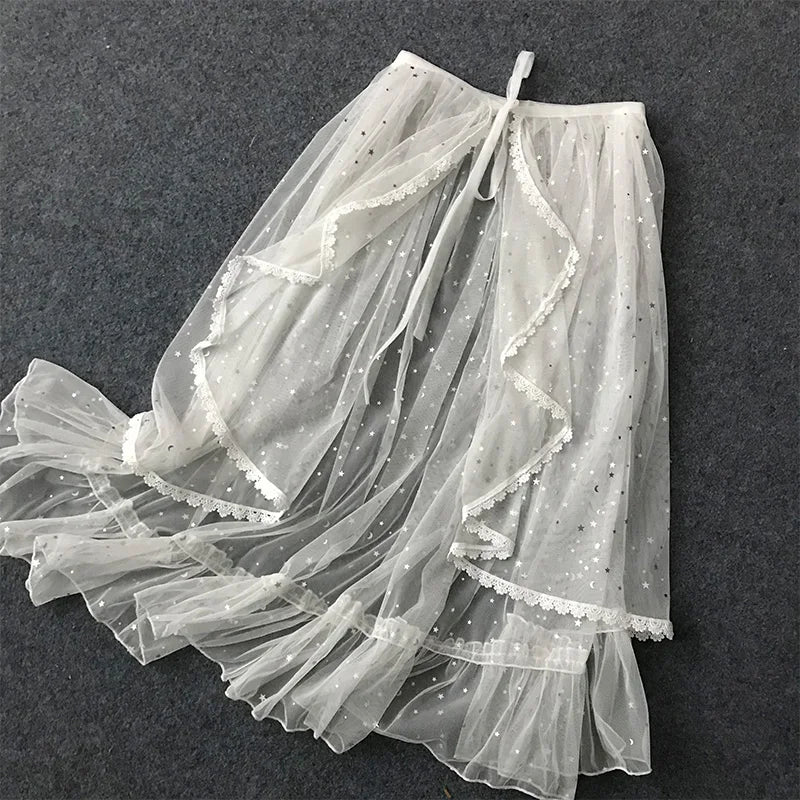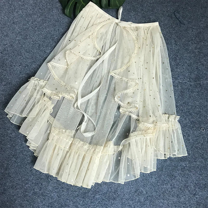 Japanese Sweet Lolita Lace Ruffles Skirt for Women, Asymmetrical Mesh, Cute Curtain, Sheer Cover Up, Princess Fairy, Bling Star
