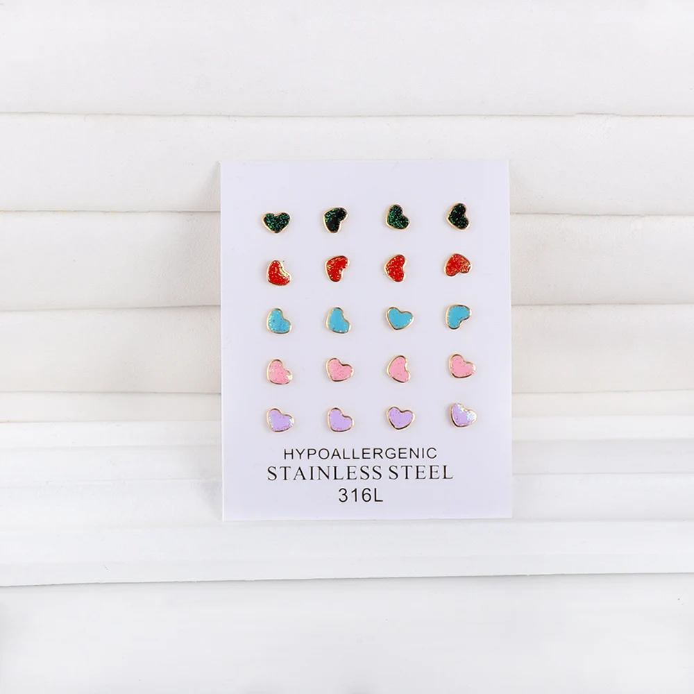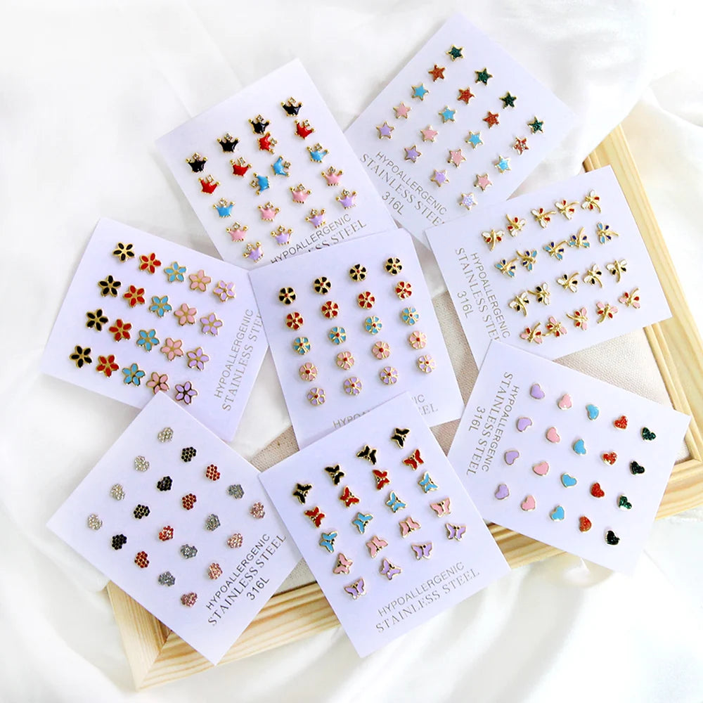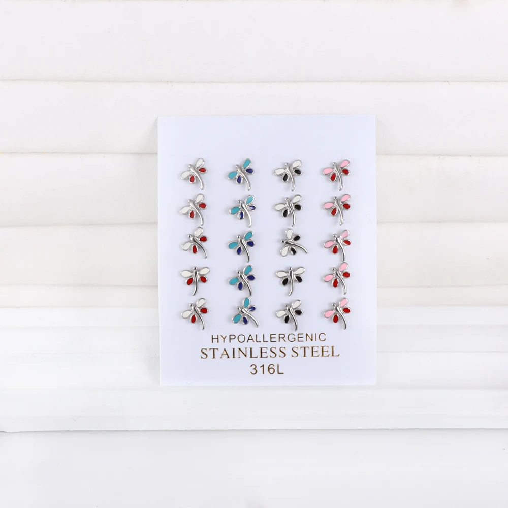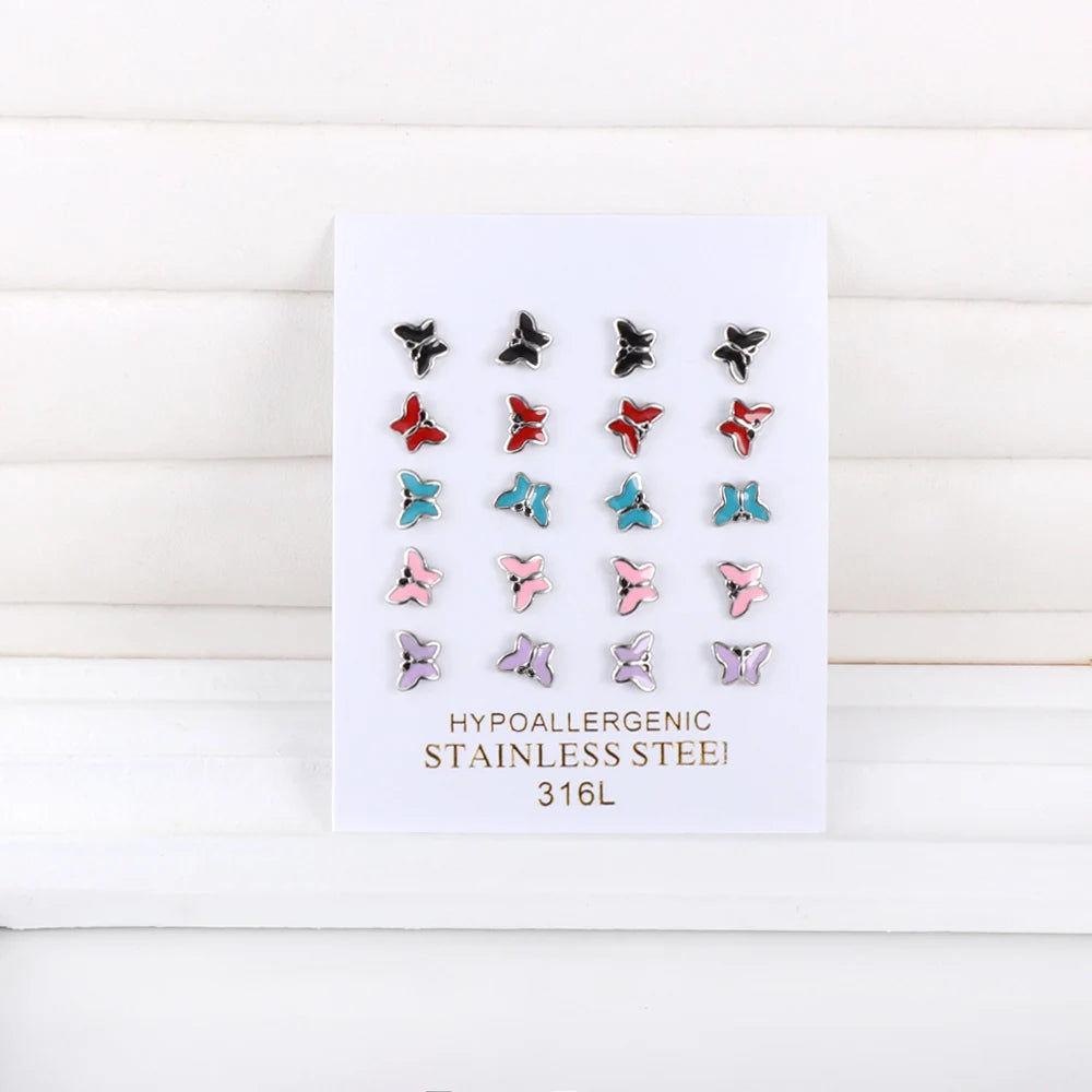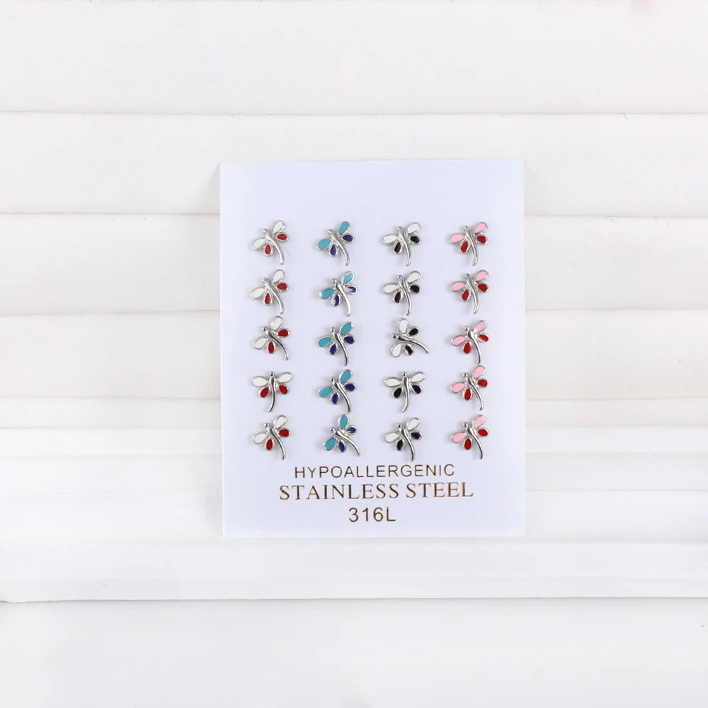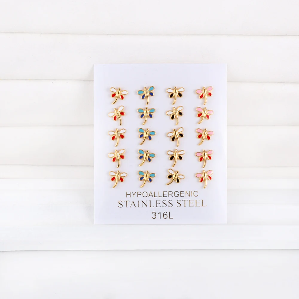 LUXUSTEEL 10Pairs Mini Colorful Butterfly Heart Flower Dragonfly Stud Earrings for Girls Stainless Steel Hypoallergenic